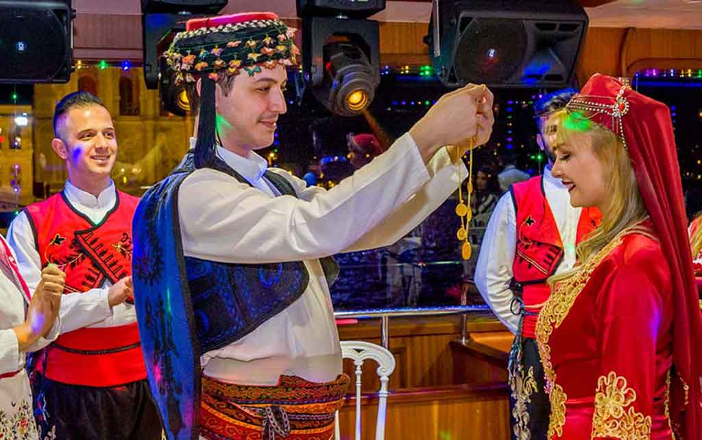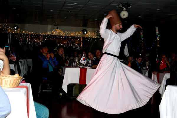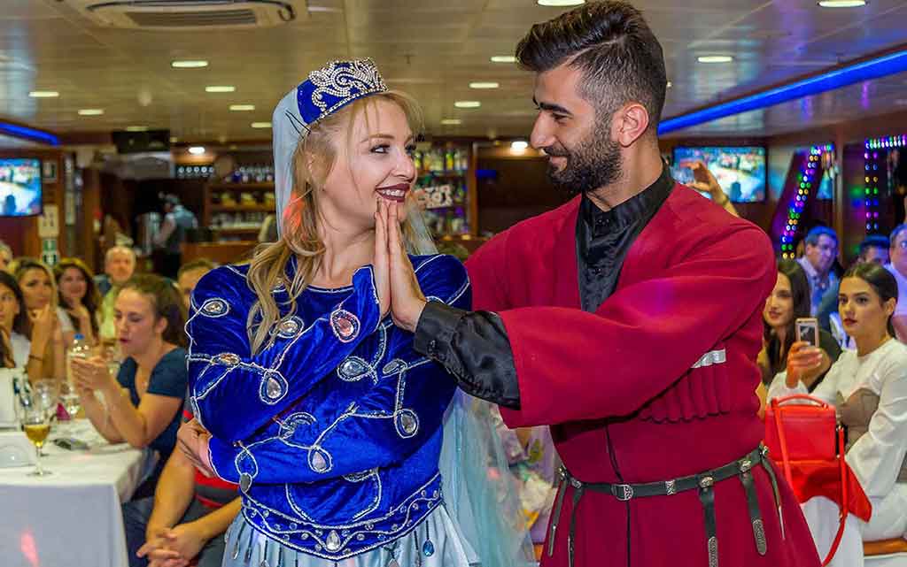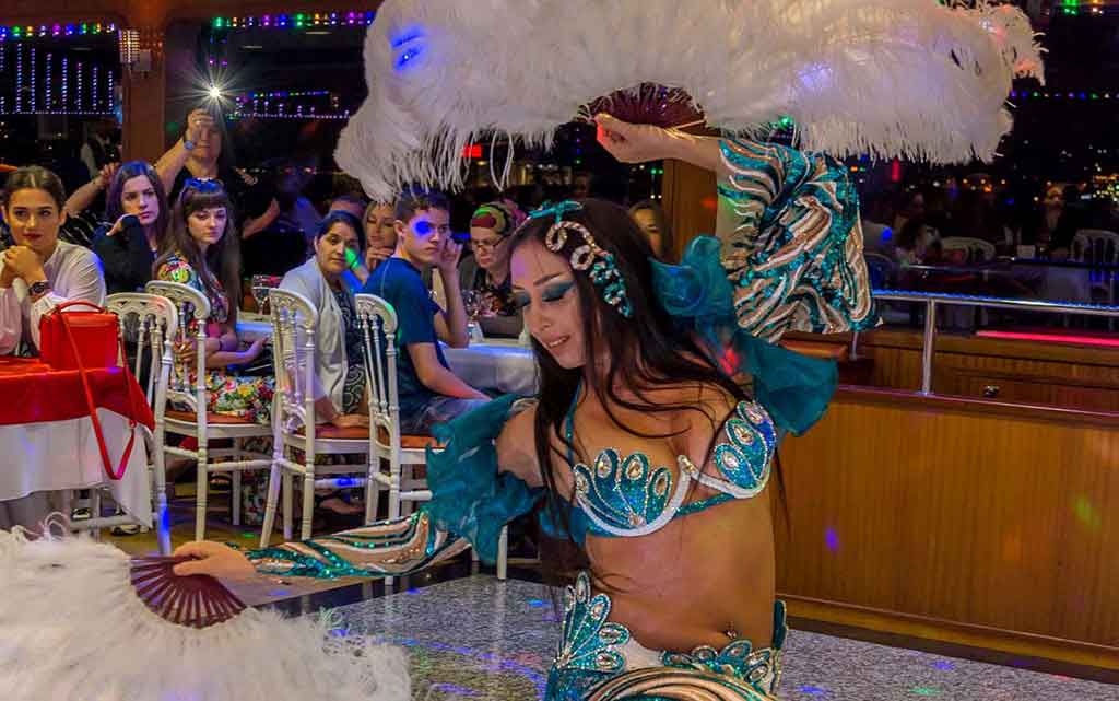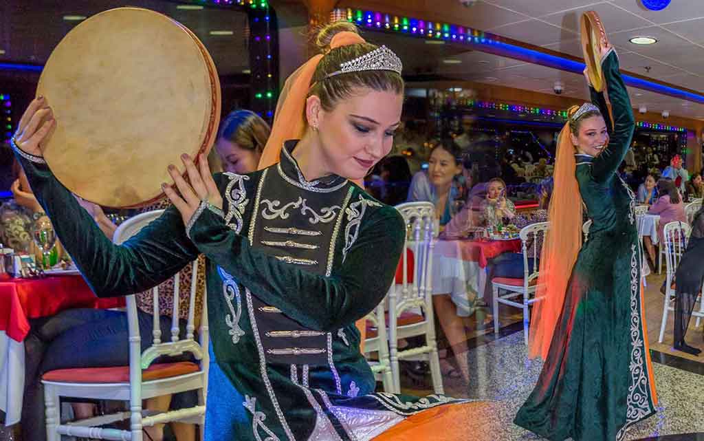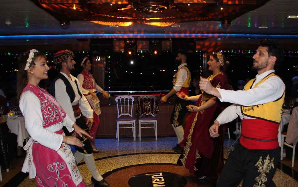 Continue your evening cruise with traditional Turkish fare and relish unlimited drinks served from your friendly host. See the sample menu in the itinerary. As you sip your drink comfortably, the folklore show will begin.