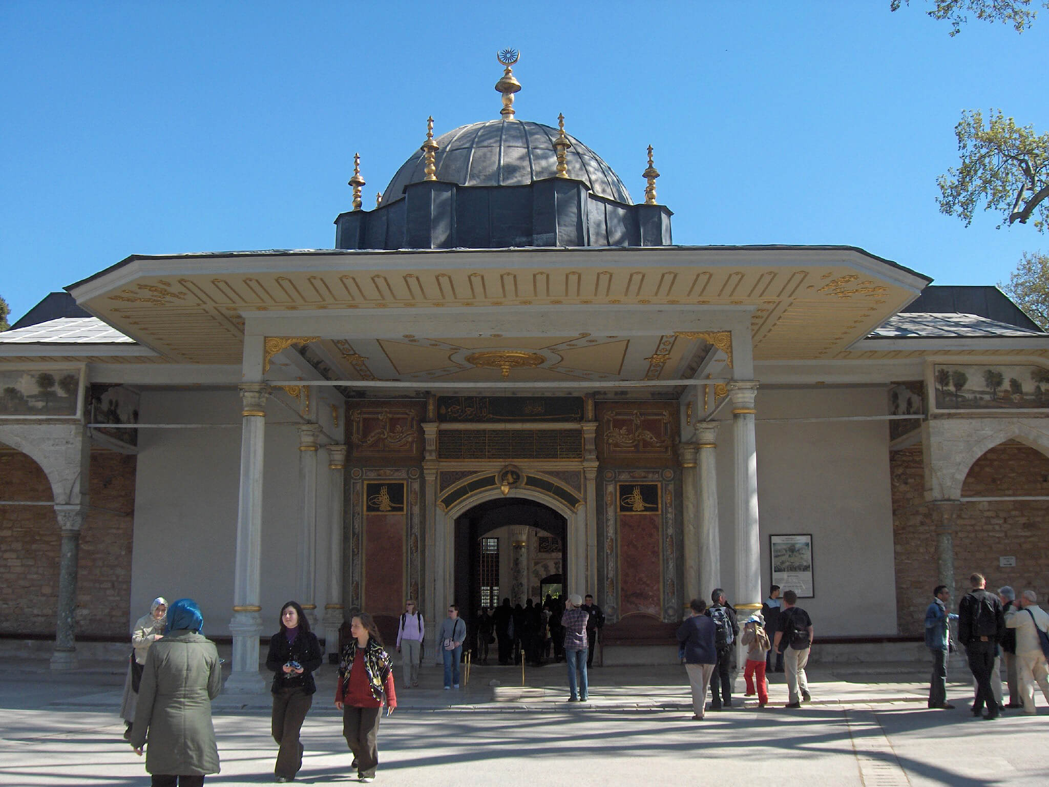The great palace of the Ottoman sultans from the 15th to the 19th centuries, housing an exquisite collection of precious gems, jewellery thrones of sultans, robes worn by the sultans and their families; miniatures, the Holy Mantle; CHABER OF SACRED RELICS. (Harem is not included in the program and visit is due to extra entrance fee.